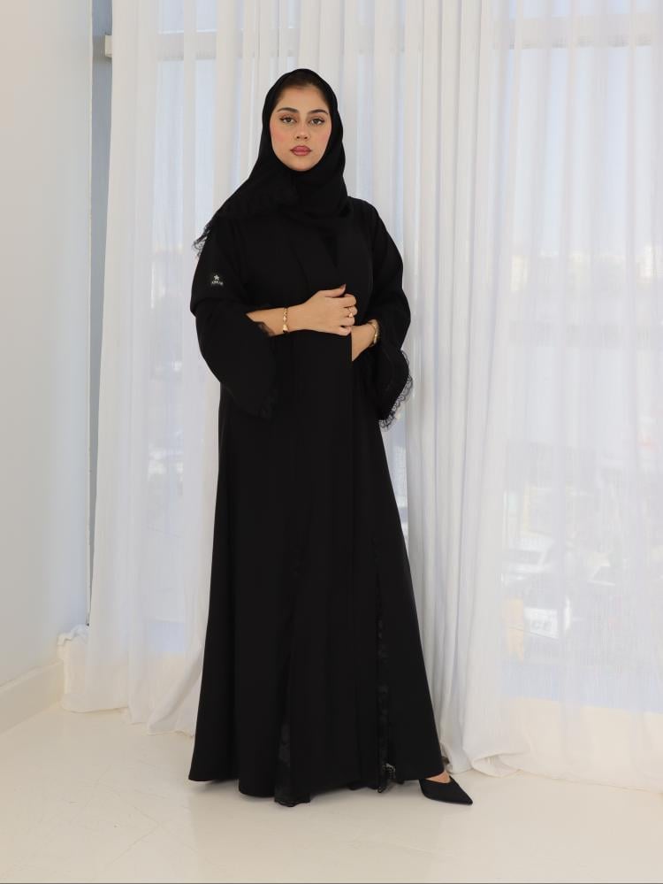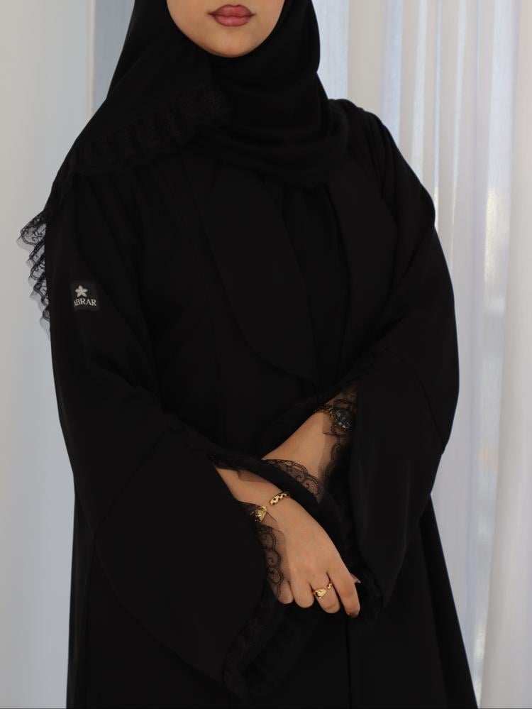 عبايه سوداء مع دانتيل وفتحة في الكم أنيقة وملائمة للمناسبات والتسوق والتجول او كنت تحضرين حدثاً