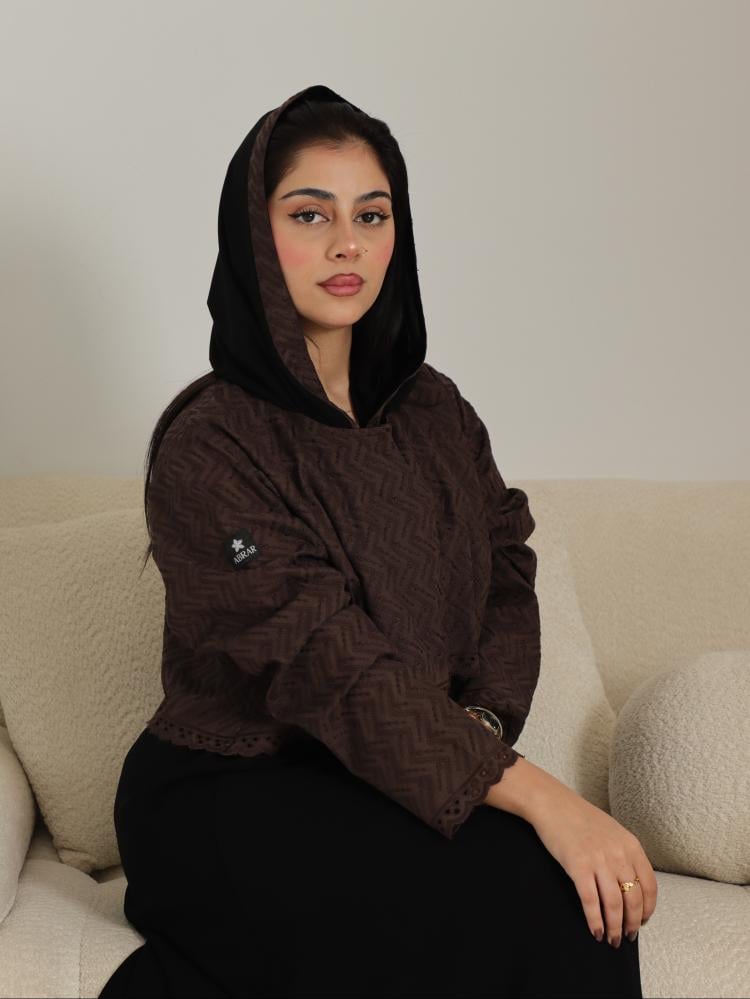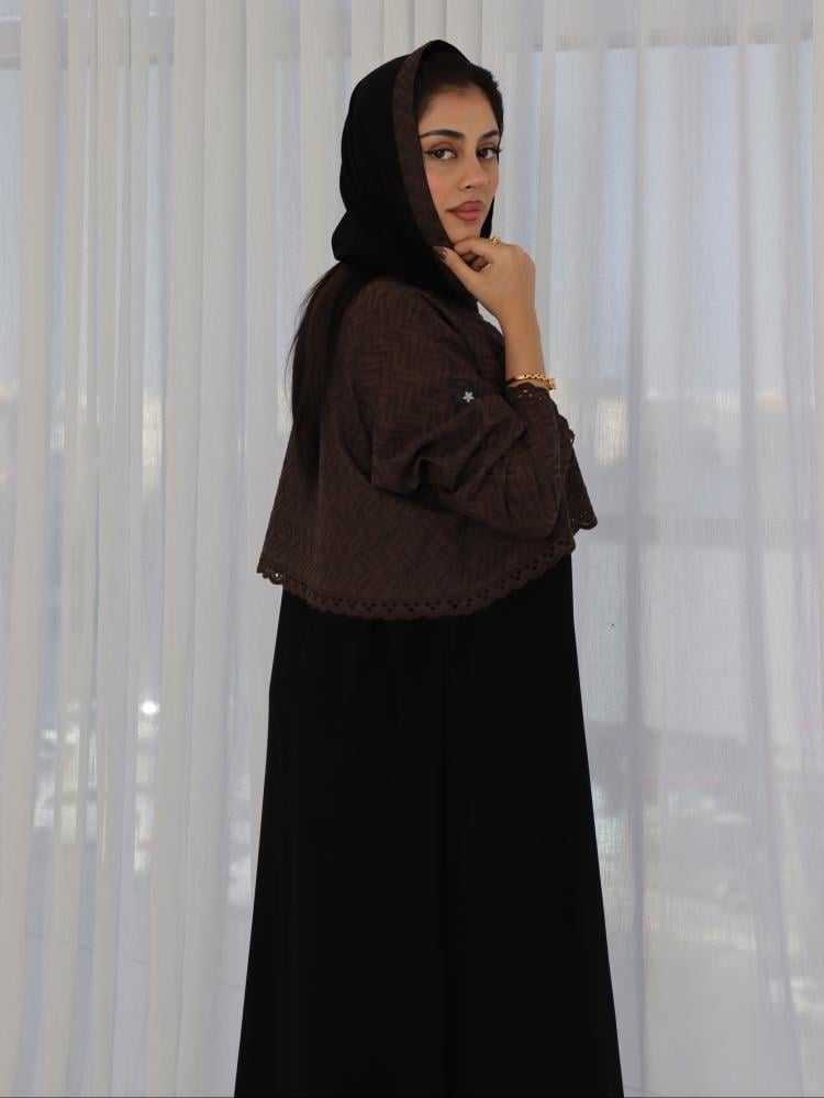 عباية استثنائية بتصميم يبرز الأناقة والرقي، مع لمسات علوية من القماش البني المزخرف بأشكال هندسية تضفي على إطلالتك لمسة فريدة. التفاصيل الدقيقة مثل الحواف المزينة تضفي جمالًا خاصًا، مما يجعلها الخيار المثالي لإطلالاتك اليومية والمناسبات. إذا كنتِ تبحثين عن الأناقة مع لمسة من التميز، فهذه العباية هي خيارك الأمثل!